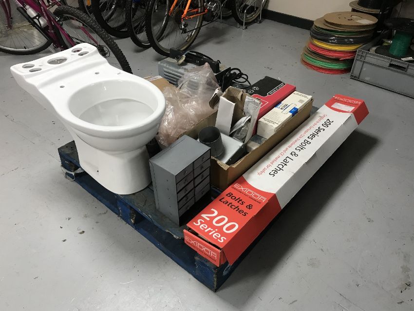 A pallet of toilet with cistern, miniature metal ten drawer chest, welder, bulk head lights, fire door attachments, etc