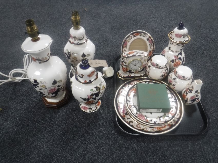 A tray containing fourteen pieces of Masons Mandalay china together with a matching set of Masons coasters