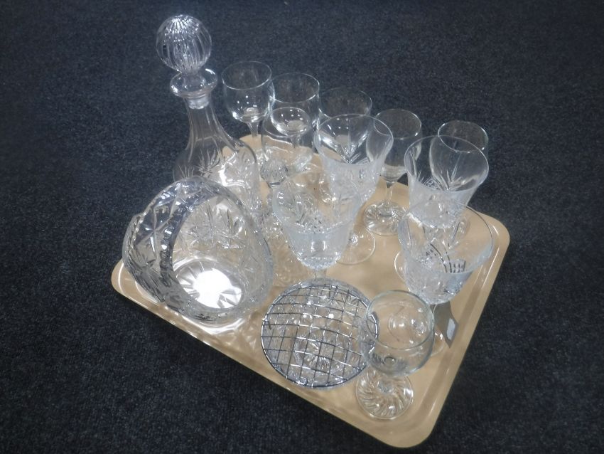A tray of lead crystal glass ware - decanter, glasses, basket etc