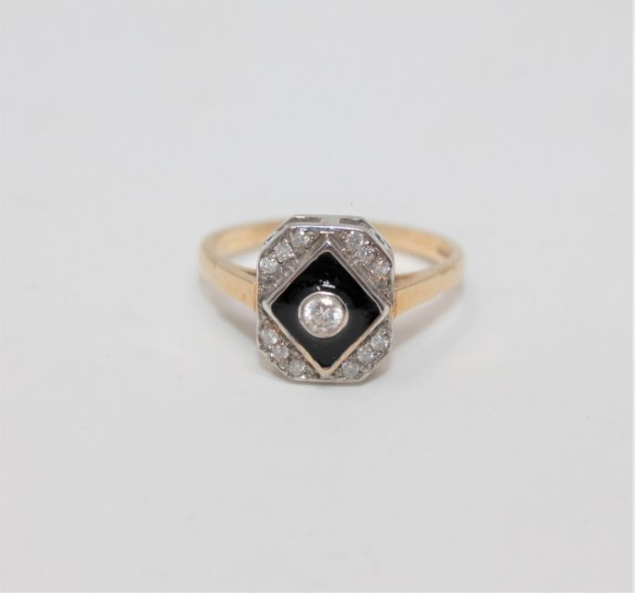 A 9ct gold enamel and diamond Art Deco style ring, size N1/2