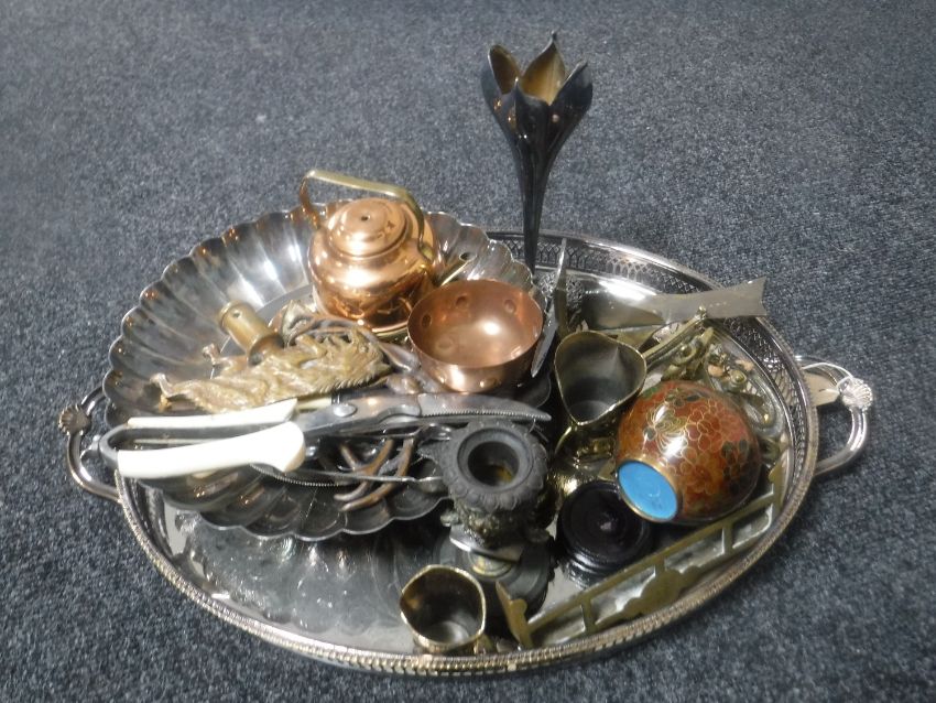 A silver plated twin handled gallery tray, assorted plated and metal wares, cloisonne ginger jar on metal base