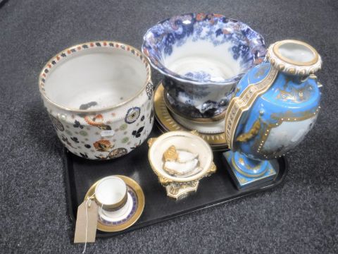 A tray of antique china, Imari gilded comport, transfer printed vase, planters etc
