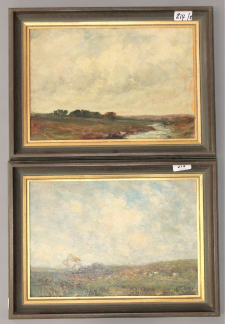 John Falconar Slater : Sheep grazing in an open landscape with cottage beyond, oil on panel, signed, 24 cm x 34 cm, together with the companion piece, both parts framed. (2)