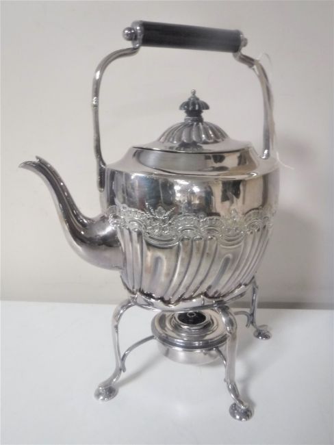 A silver plated spirit kettle on stand with burner
