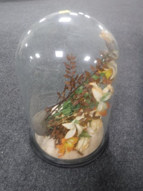 An antique glass dome on wooden stand