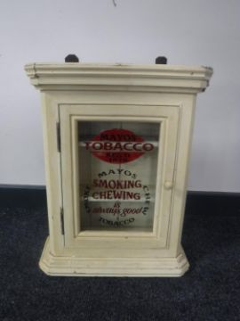 A painted pine wall cabinet bearing Mayos Tobacco advertising