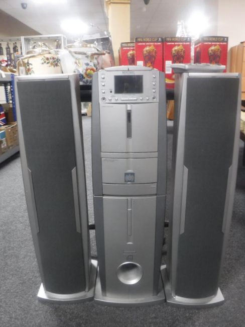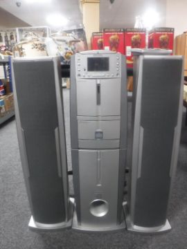 A Ministry of Sound power tower music system with speakers and remote.