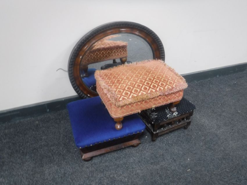 An Edwardian mahogany framed mirror and three various stools