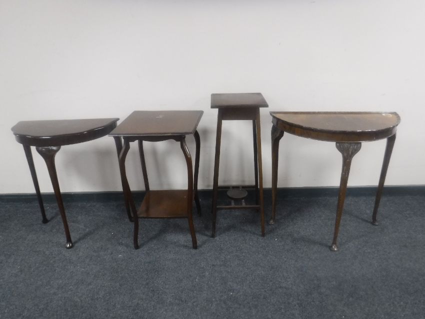 An Edwardian occasional table, plant stand and two D-shaped hall tables