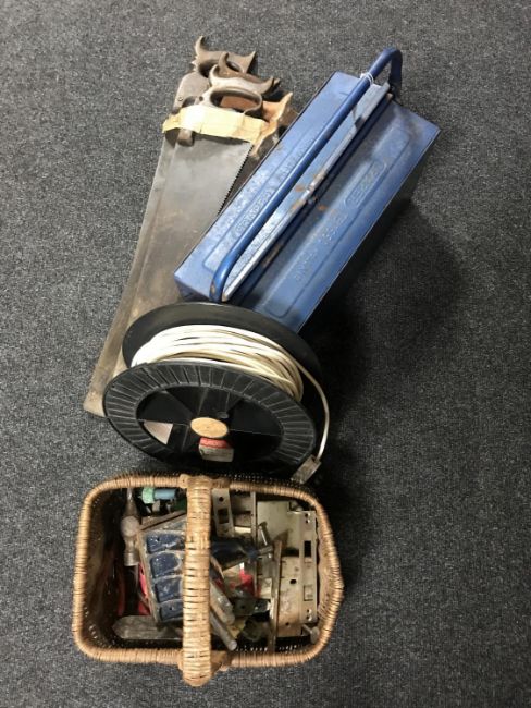 Six vintage hand saws, metal tool box by Draper, extension lead and hand basket of clamps, door locks etc