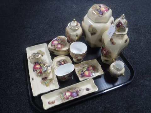 A tray of eleven pieces of Aynsley Orchard Gold fruit patterned china and two bird pill boxes