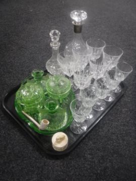 A tray of cut glass decanter with silver collar, decanter, assorted drinking glasses, Art Deco glass trinket set, clap pipes