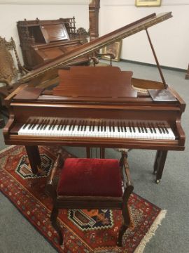A mahogany cased Steindorf baby grand piano retailed by Waddington & Sons Ltd, Newcastle Upon Tyne, width 141cm, together with a beech storage piano stool