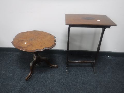 A Victorian figured walnut shaped pedestal occasional table together with an inlaid mahogany side table