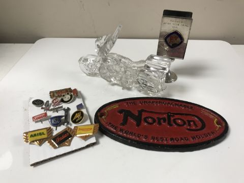 Motorcycle memorabilia to include a German glass motorcycle ornament, cast iron Norton plaque, British motor cycle and light car club trophy (1931) together with fifteen lapel badges including, Goliath, Harley, BSA, Heinkel etc.