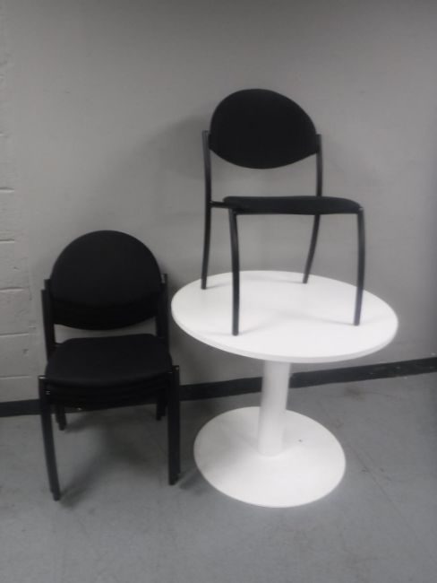 A white office table and five Narbutas stacking chairs