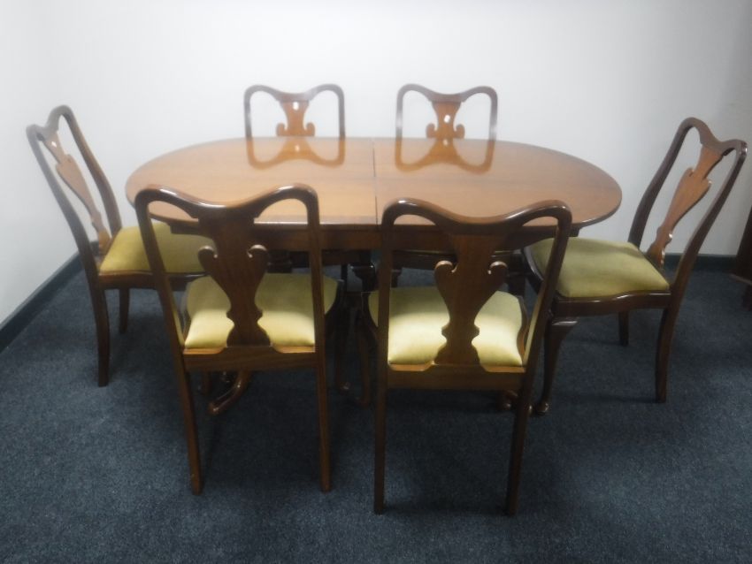 An inlaid mahogany Regency style pedestal dining table with leaf together with a set of six walnut Queen Anne style chairs