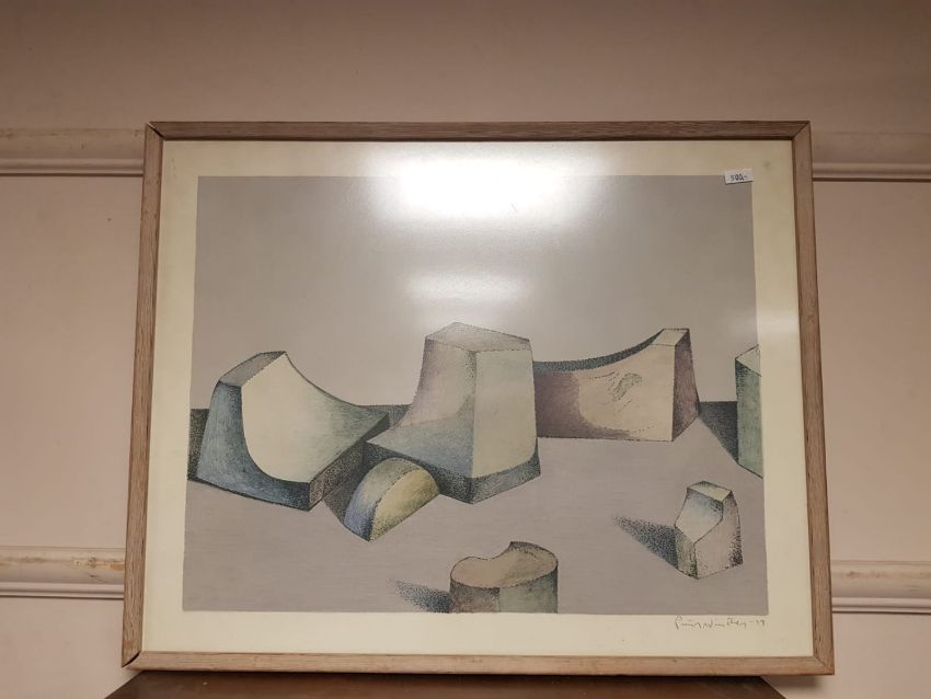 20th century continental school, still life of abstract shapes, reproduction in colours, indistinctly signed in pencil, 52cm by 40cm