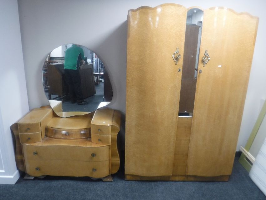 A 1930's bird's eye maple double door wardrobe with dressing table