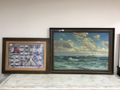 A framed oil on canvas - seagull in flight initialled I.C.M. and a framed nautical knot montage