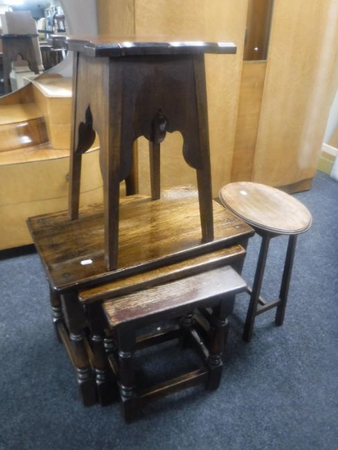 A nest of three oak tables and two plant tables
