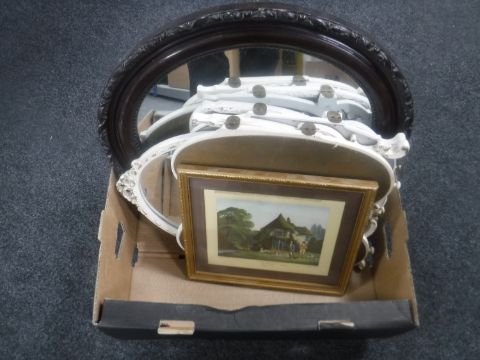 A box of two dressing table mirrors, antique mahogany framed mirror and a print