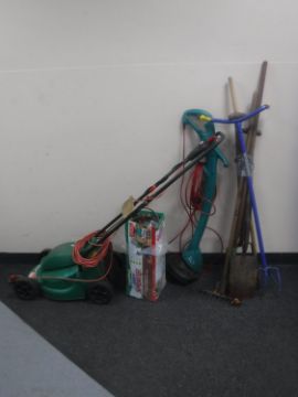 A bundle of garden tools, fence sprayer, Qualcast mower and a strimmer