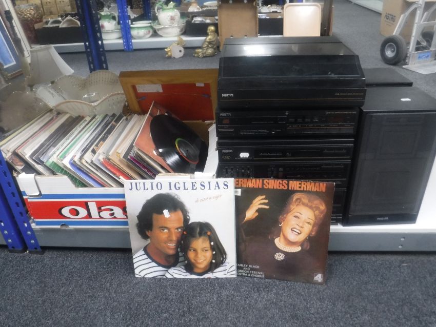 A box of collection of LP records - easy listening and a Philips hi/fi system with speakers