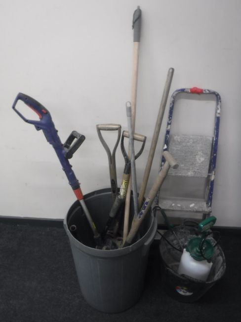 A bin of garden tools, strimmer, folding steps and two 20 litre buckets
