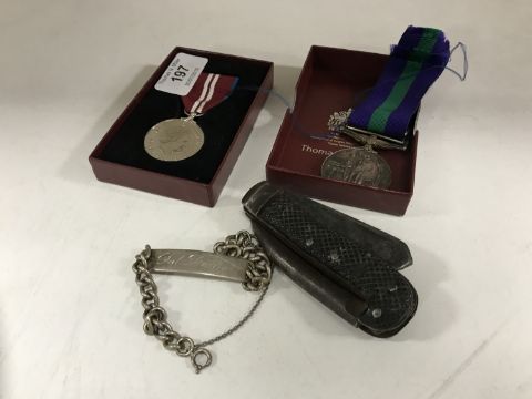 A General Service Medal with canal zone bar presented to Private R. T. Lowry, with a Queens Diamond Jubilee medal, vintage pocket knife and a silver identity bracelet bearing the name Dick Lowry