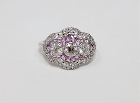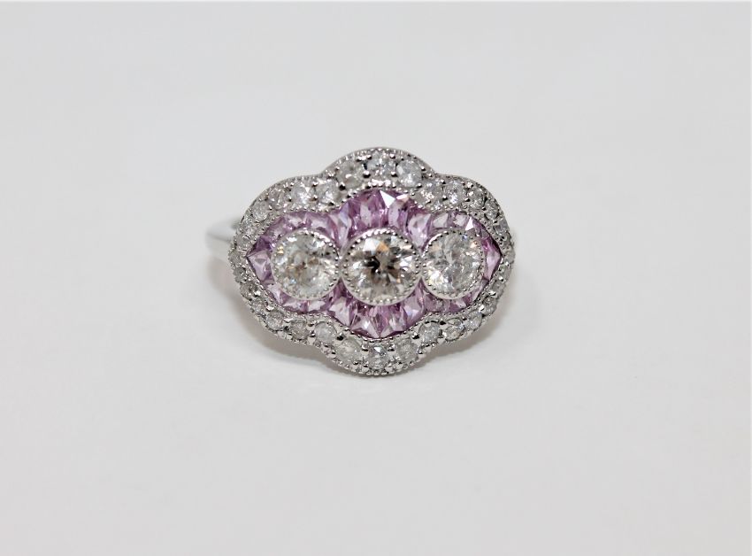 An 18ct white gold sapphire and diamond ring featuring 3 centre round brilliant cut diamonds, bezel set 0.5ct, 22 baguette cut pink sapphires 0.3ct and 32 round brilliant cut diamonds 0.3ct.