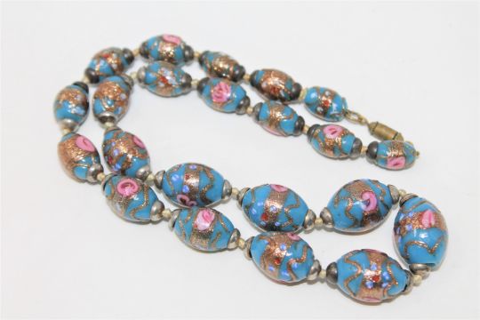 An Edwardian blue glass beaded necklace, individually hand-knotted and highlighted with pink and gold-tone.