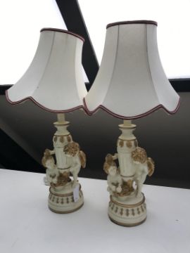A pair of cream and gilt chalk figural table lamps decorated with cherubs