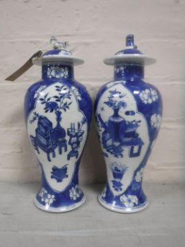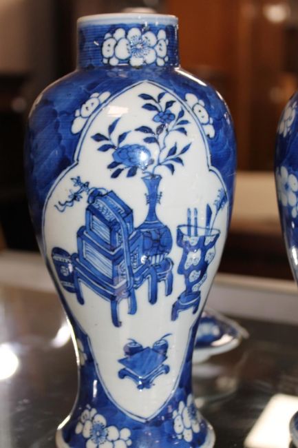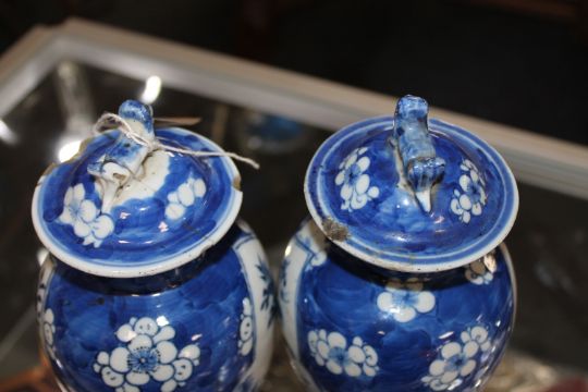 Some damages. Both lids broken and re-glued. One vase with a hairline at the rim. Otherwise good.