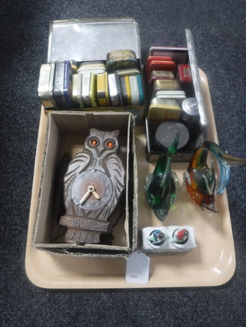 A tray of vintage tins, Pico wall clock in the form of an owl, cased servers, two glass fish, together with a piece of Killarney tourist china