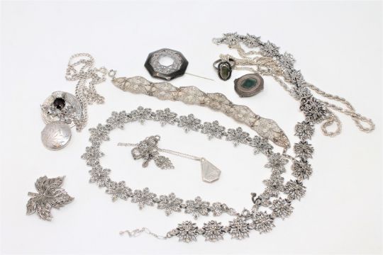 A good collection of silver and white metal jewellery, marcasite, filigree bracelet etc.