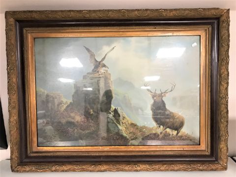 A Victorian mahogany and gilt framed print depicting a stag and eagle in highlands