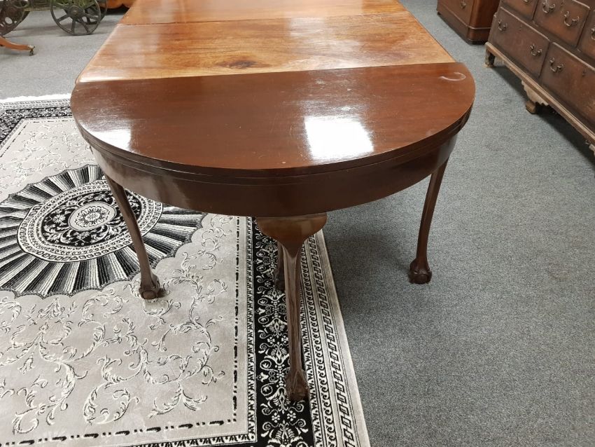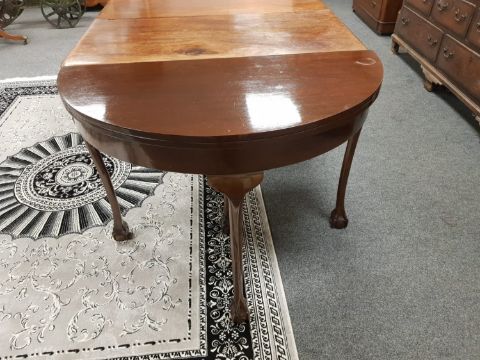 A mahogany demi-lune foldover top table on claw and ball feet, width 107 cm.
