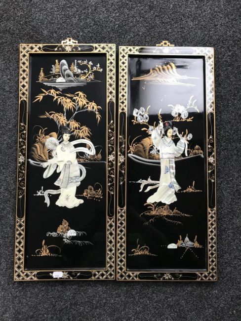 A pair of Japanese black lacquered mother of pearl panels depicting Geisha