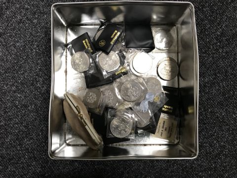 A tin containing a quantity of British Crowns, purse of half penny pieces etc