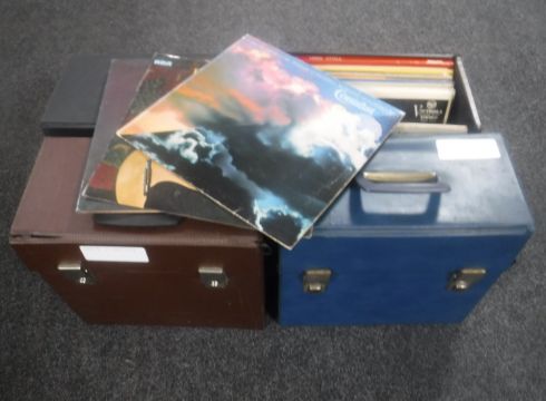 Four cases of LP records; three containing classical on HMV Decca labels, the other jazz including Art Blakey