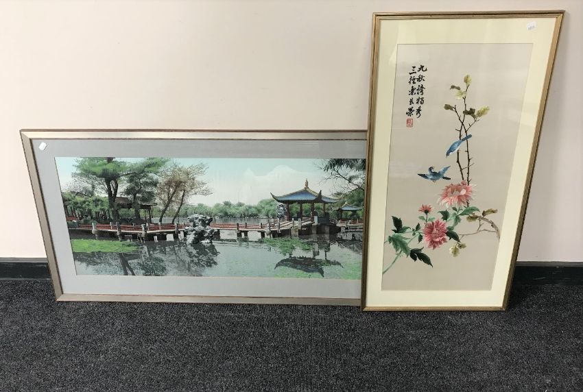A gilt framed Japanese silk work panel depicting birds and flowers together with a further Japanese panel