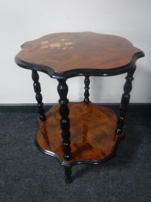 An Italianate style two tier occasional table in walnut finish