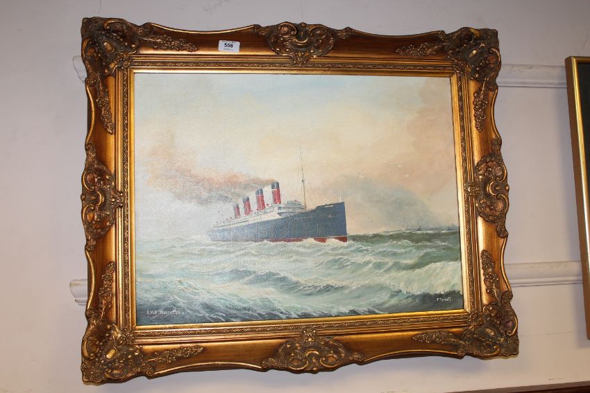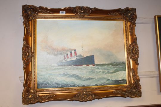 Fred Tordoff : R.M.S. Mauretania, oil on canvas, 60 cm x 45 cm, with Cunard label verson, framed.