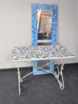 A wrought iron mosaic topped table together with an Ikea mirror