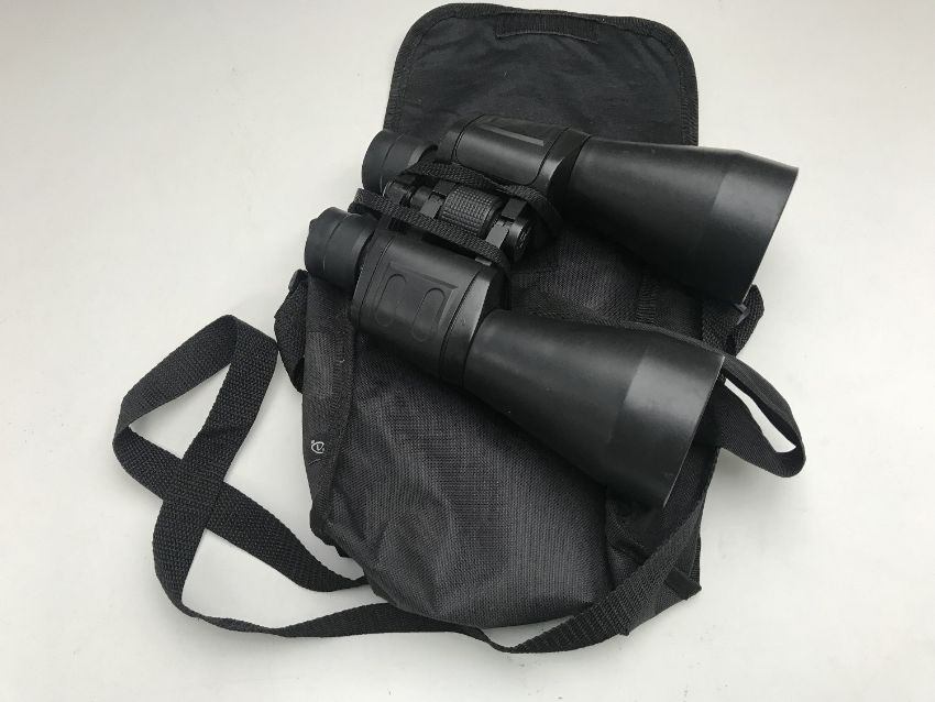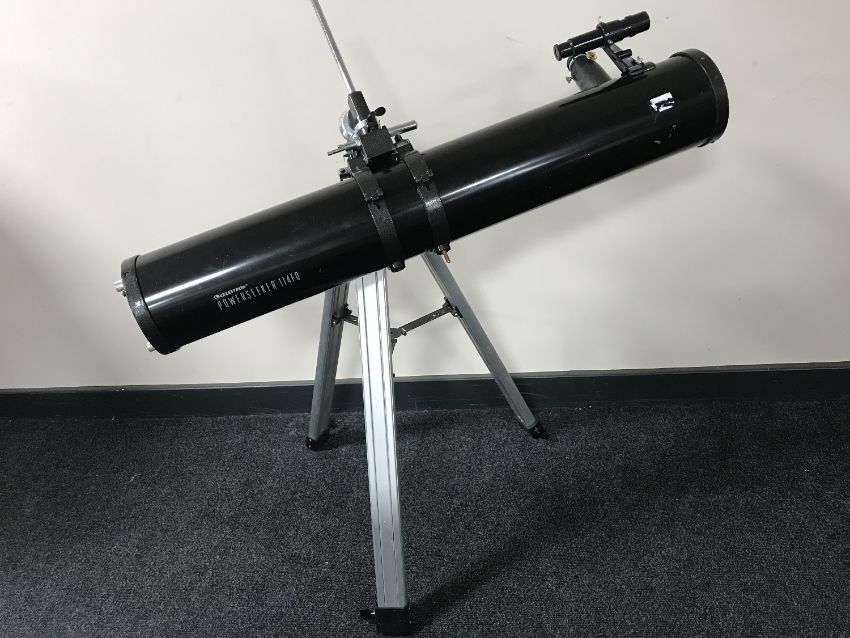 A Celestion Power Seeker 114EQ telescope on stand together with a set of 8x60 binoculars