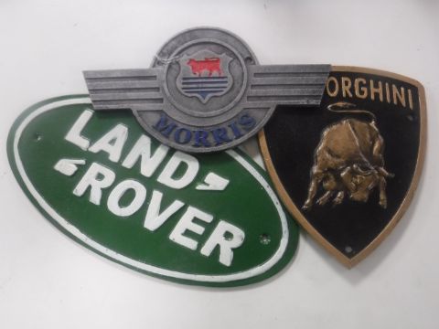 Three cast iron plaques - Land Rover, Morris and Lamborghini