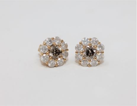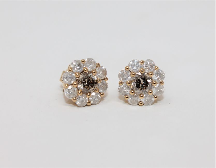 A pair of 18ct yellow gold diamond stud earrings featuring two round brilliant cut cognac diamonds 1.101ct with 16 round brilliant cut diamonds 1.53ct.