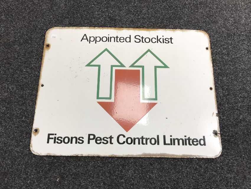 A twentieth century enamel sign - Fisons pest control appointed stockists, 51cm by 38cm.