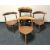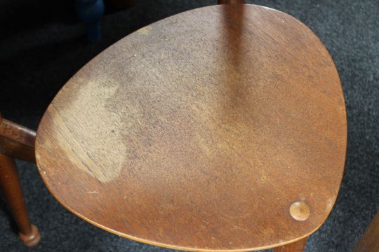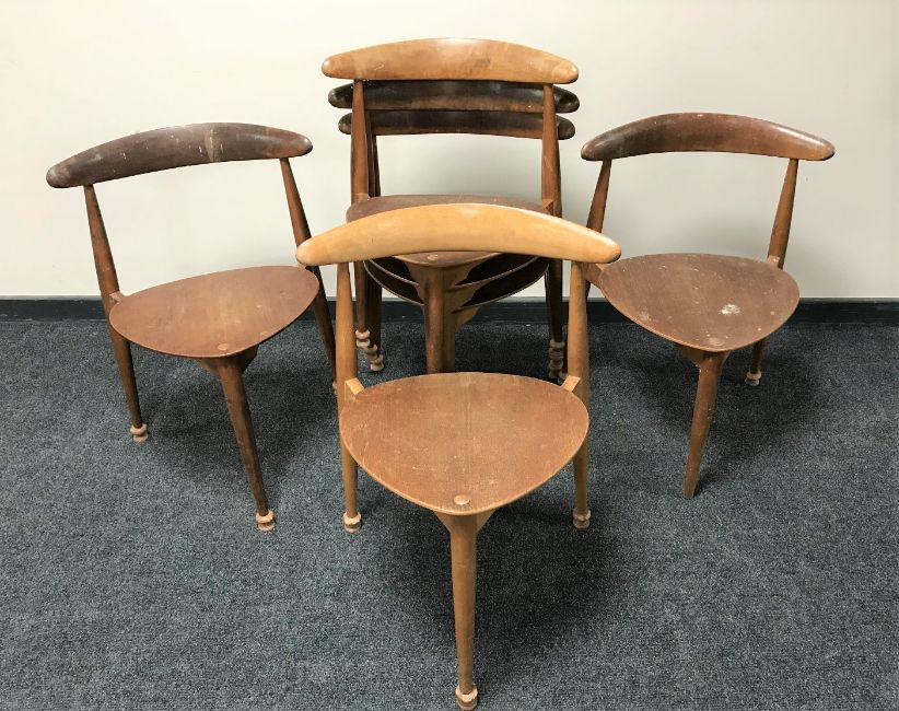 The chairs have later caps screwed to the feet to raise them. Two or three have slight movement in the joints. all have typical cosmetic signs of age and use, to include minor scuffs and surface scratches, water marks and a couple have some splashes of white paint.